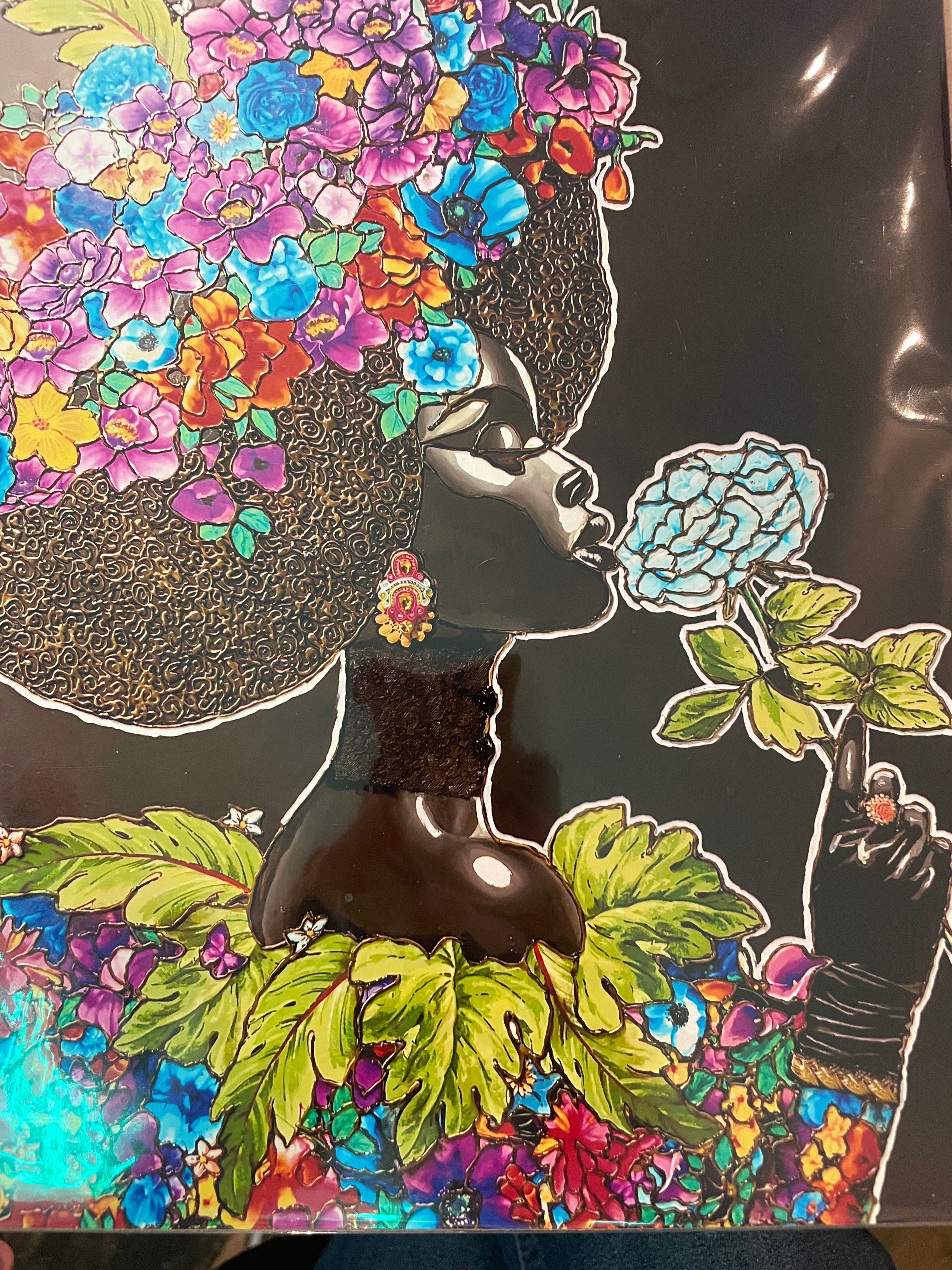 Sheila Fox, also known under the name GodivaGoddess, is a self-taught mixed media artist based in Louisville, KY. Fox has been drawing for over 20 years, and painting for almost 6. Her vibrant portraits of Black women take inspiration from Fox’s own lived experience as an African American woman, as she seeks to celebrate her story and the stories of generations of Black women through the joy of artistic expression.