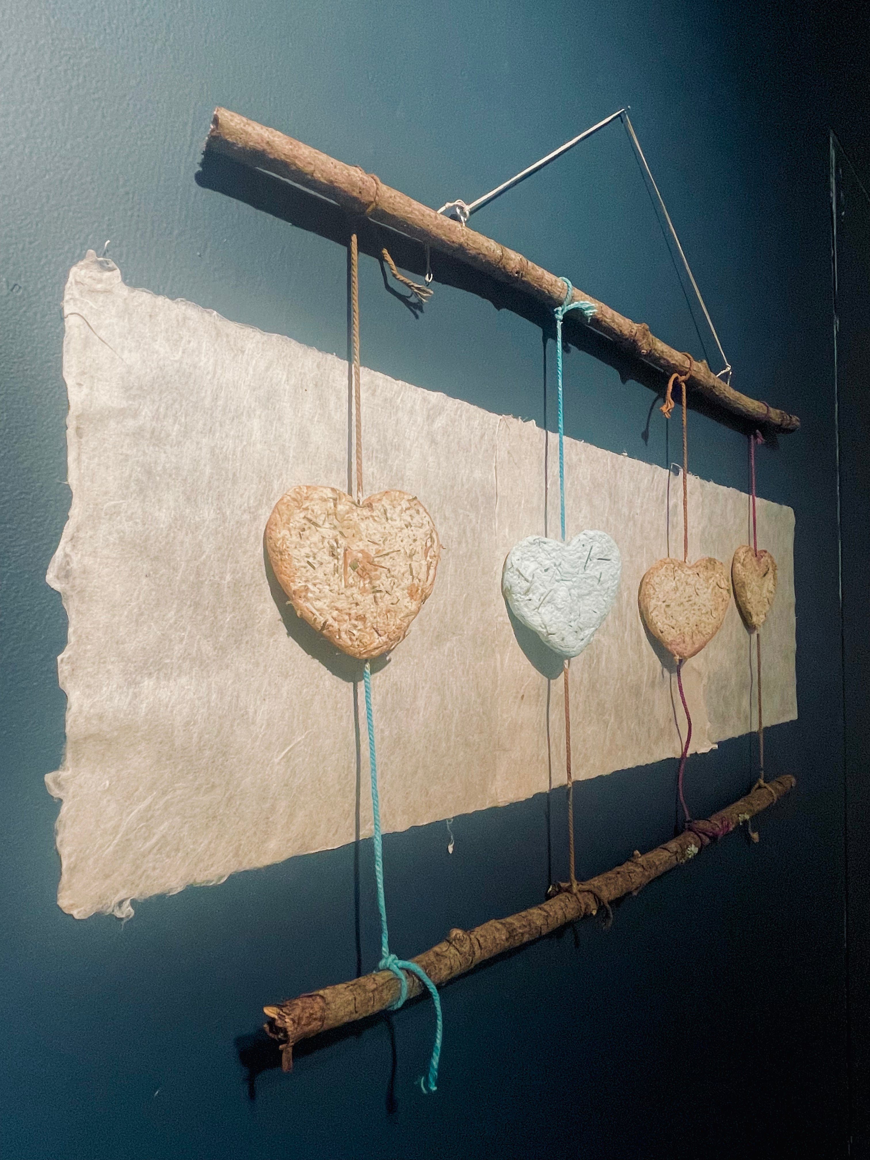 My materials are based in intentionality, down to the bookbinder's thread that holds the piece. The handmade paper hearts (my foundation) are made of cotton rag & daylily (the first fibers I ever worked with). Each heart/location is represented by a natural dye tied to each place. Buffalo = chicory, Louisville = copper oxide (Rev blue!), Portland = Douglas fir, and Oaxaca = cochinilla (cochineal). The threads begin and end with sequential dyes based on time and place. As I am resettled in the Buffalo area, my journey brought me back to where I began. Kismet? Without a doubt."