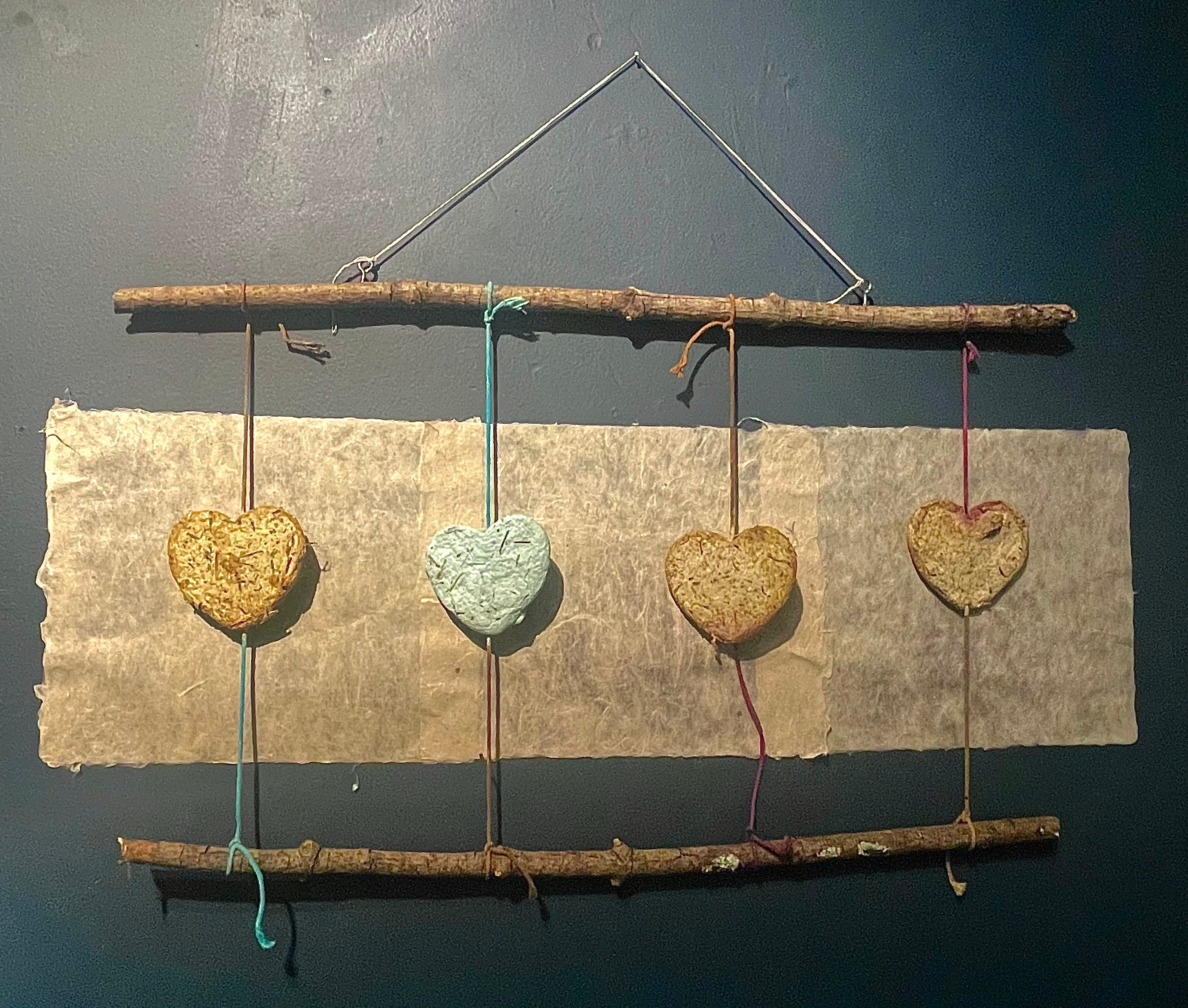 My Heart is My Home, Handmade paper (cotton, daylily, kozo), natural dyes (chicory, copper oxide, Douglas fir bark, cochineal), acrylic by Danielle Myers!