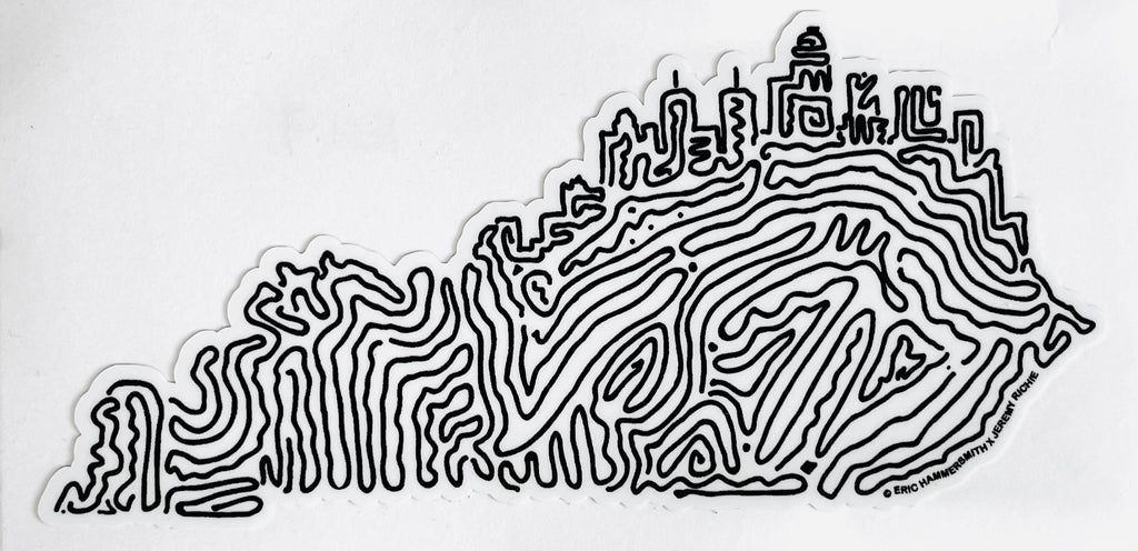 Vinyl sticker of doodled Louisville skyline over the outline of Kentucky
