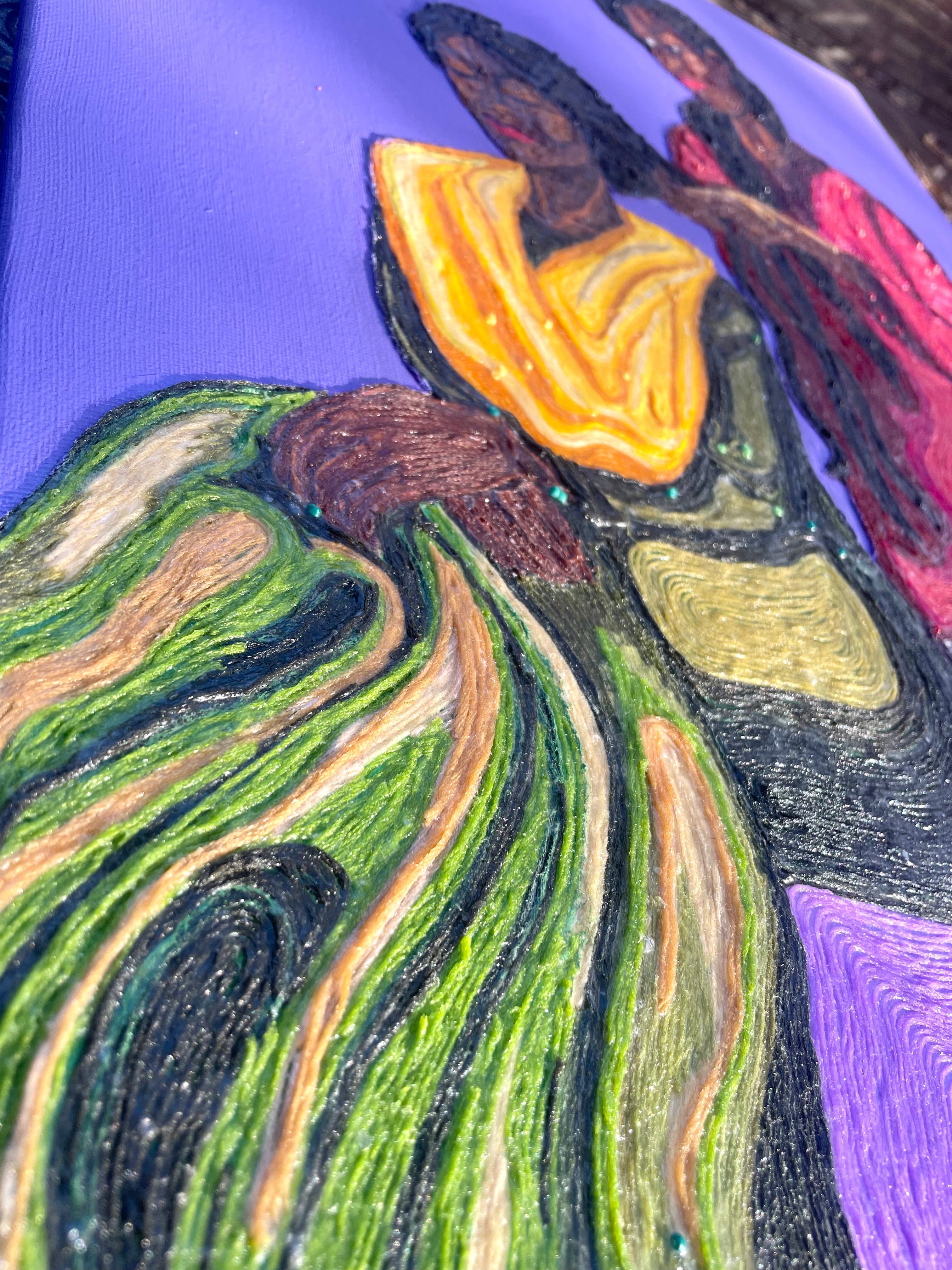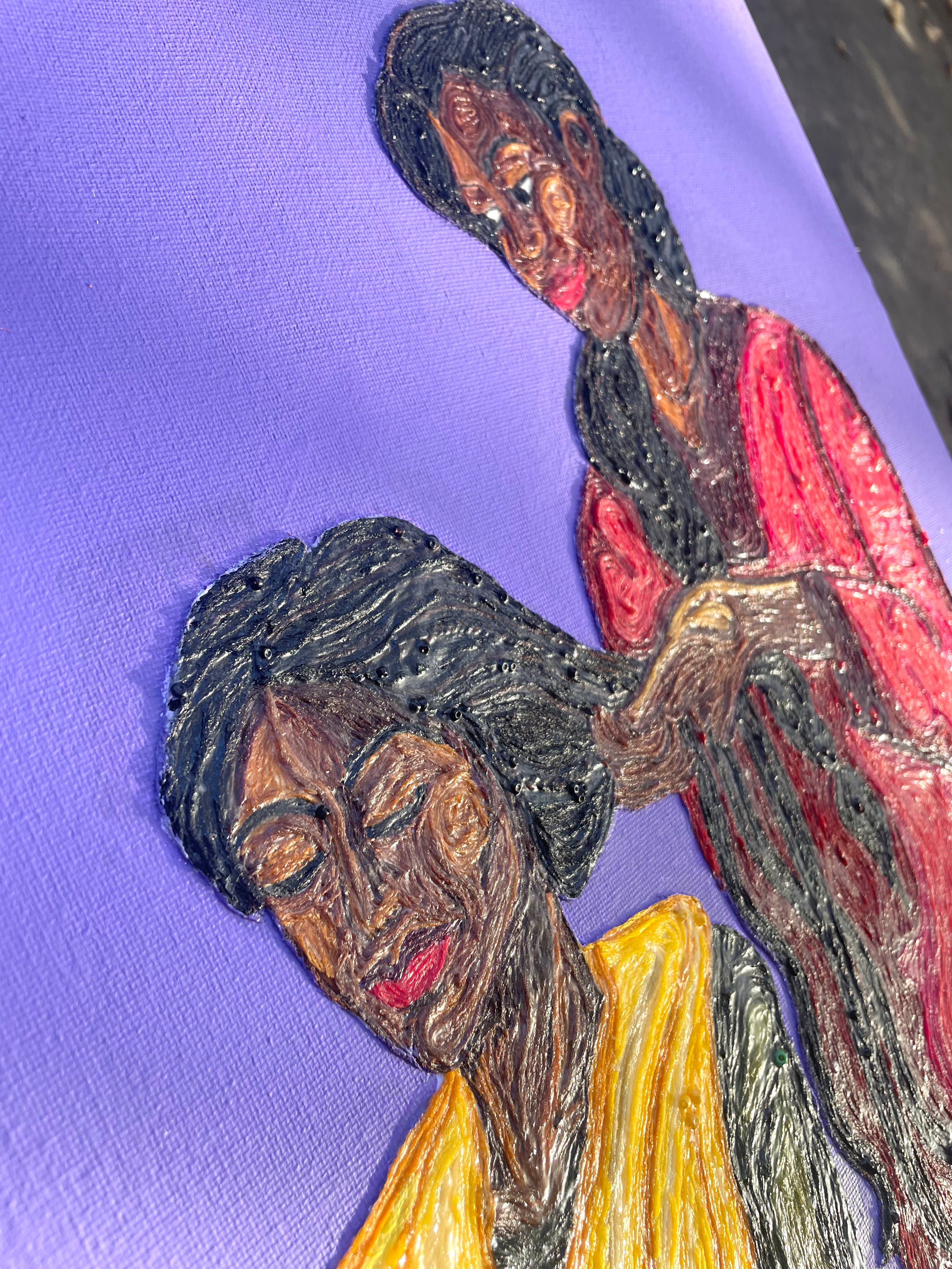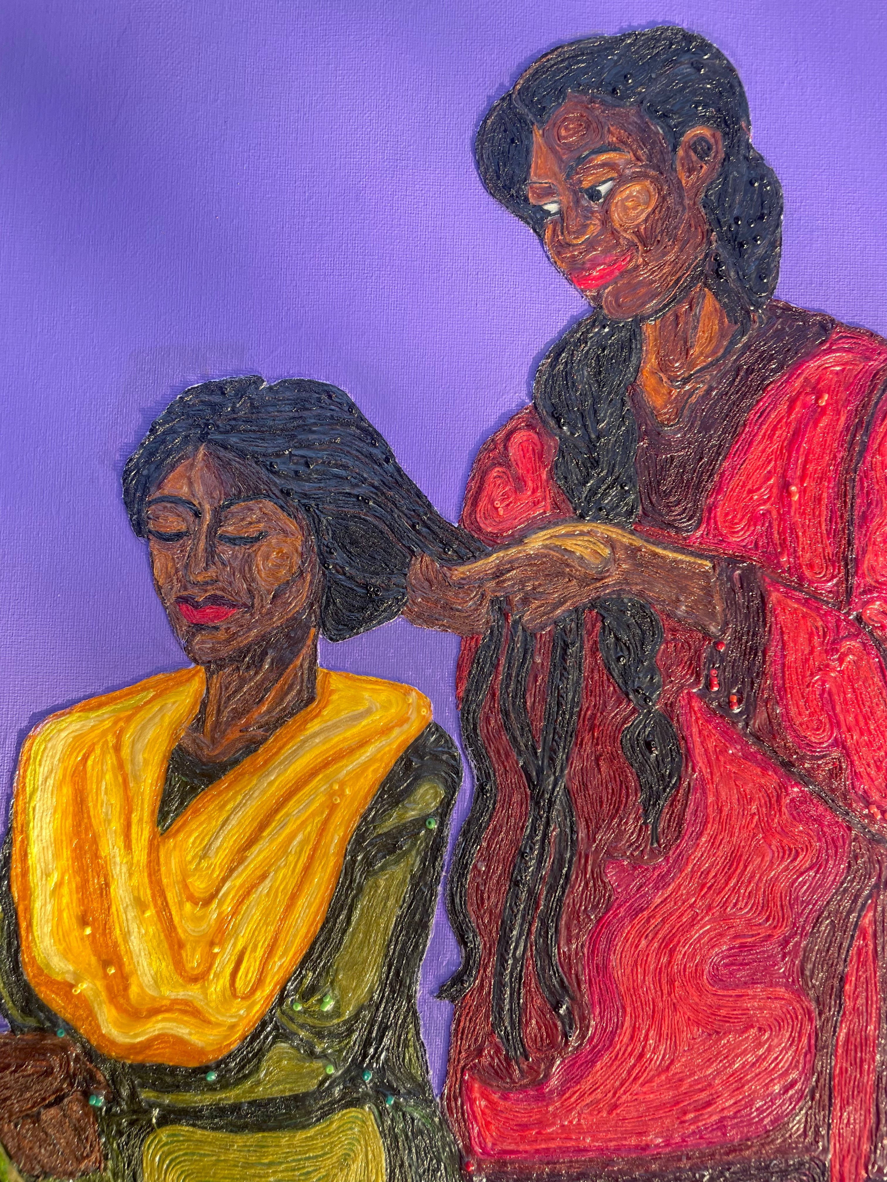 Getting Ready; thread, beads and paint on canvas, by local artist Needa Hameed