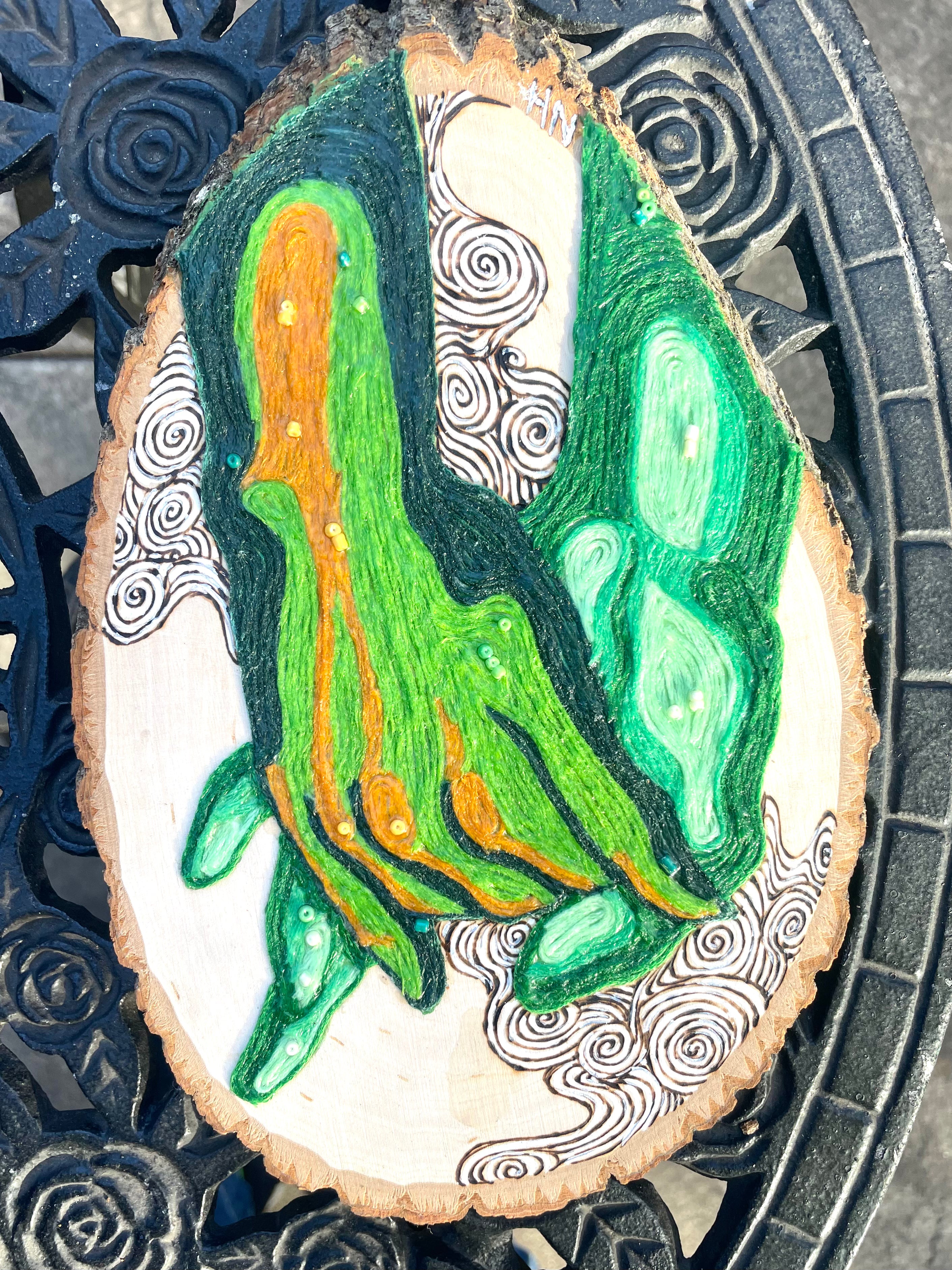 Reaching Out II; one of five in a series of studies using thread, beads and paint on wood; by local artist Needa Hameed