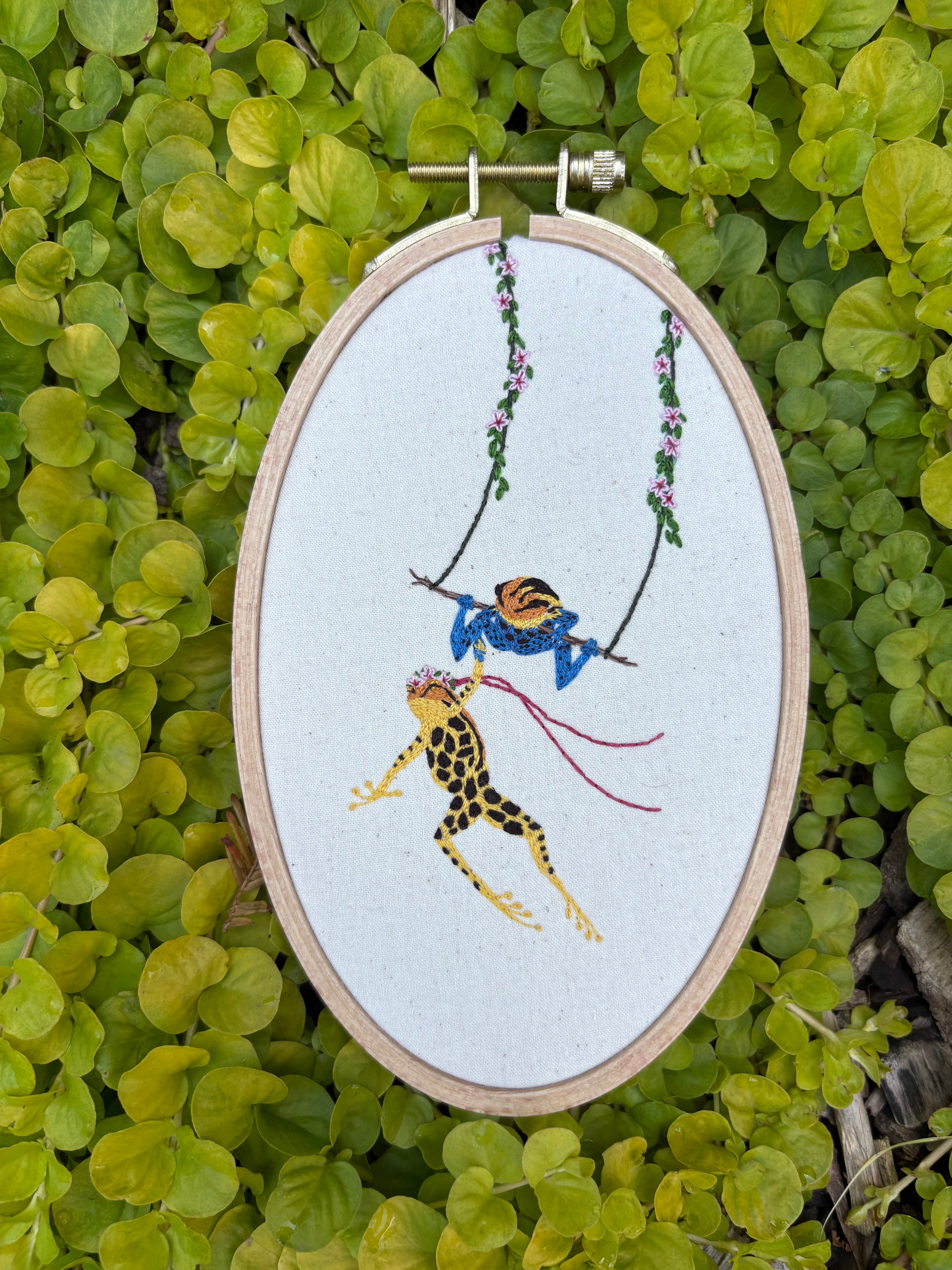 Frog Circus "Trapeze Twins," Original Embroidery by Louisville Artist Sarah Marie Heirlooms