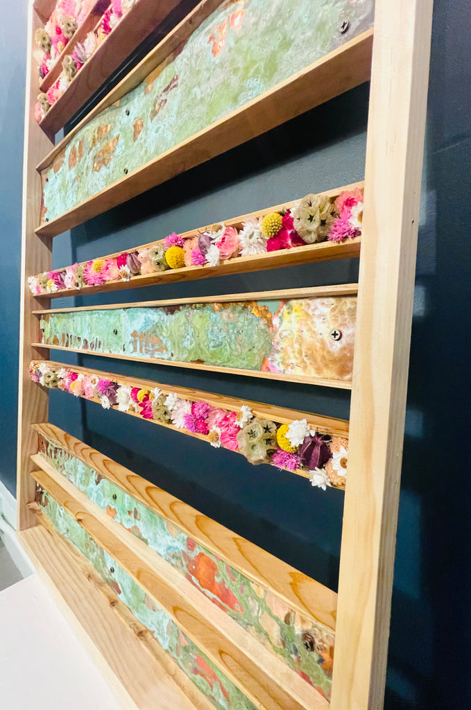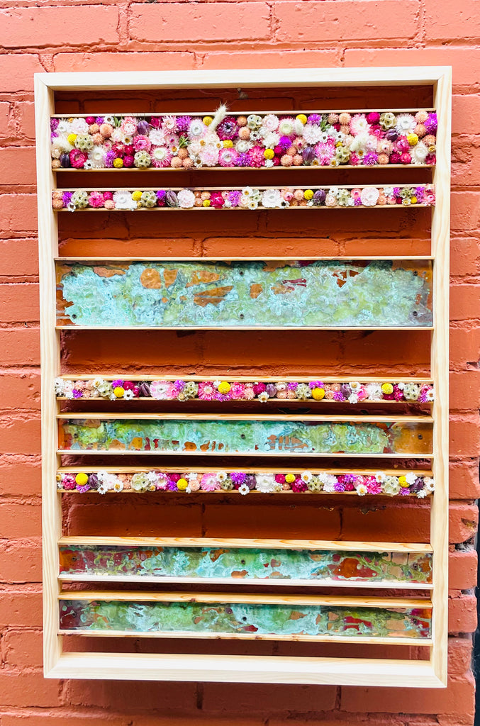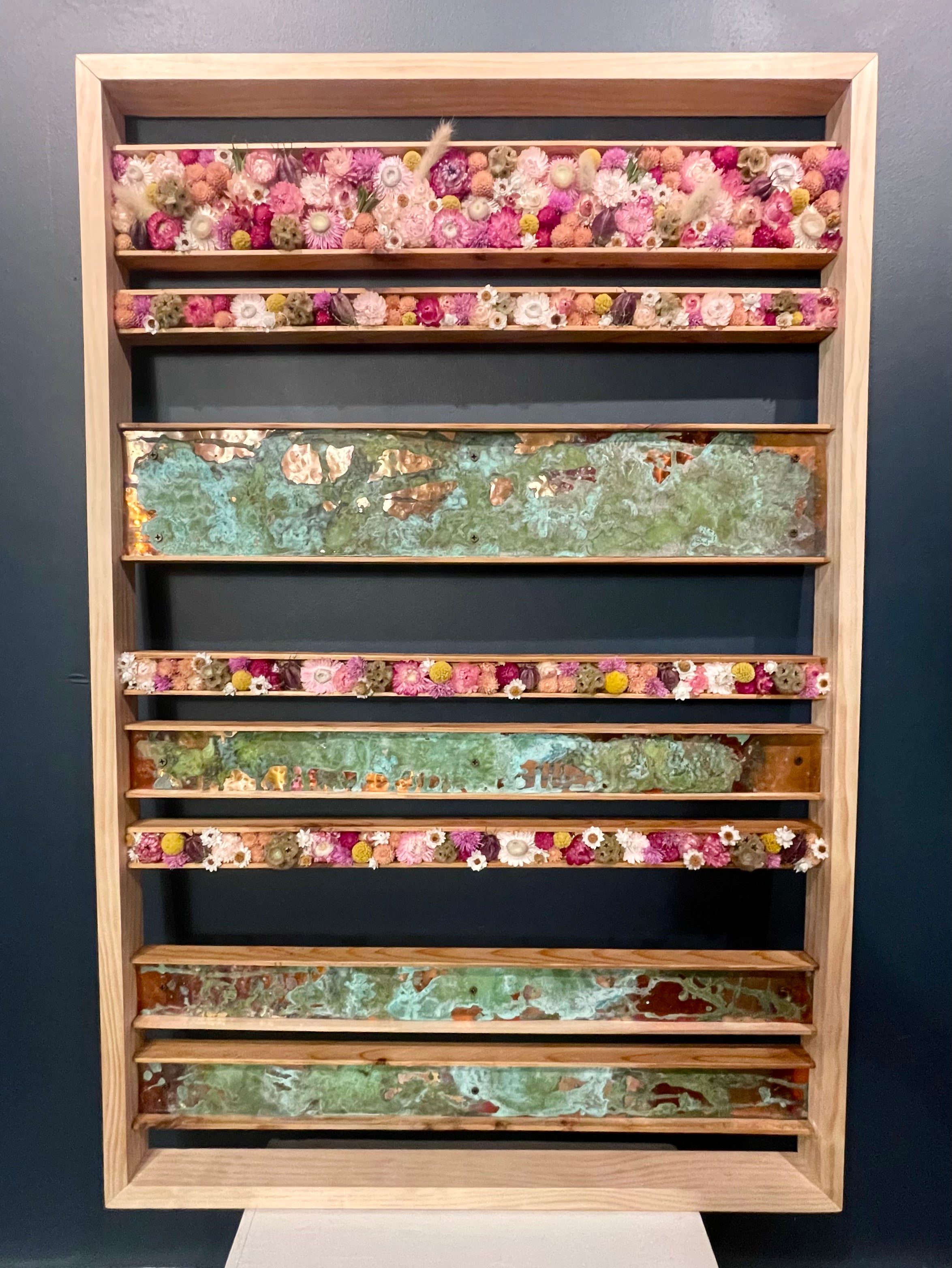 "This piece has elements that represent my journey over the last decade. When I started working at Revelry way back in the Barrett Avenue days, my work was fully focused on metal fabrication. I spent countless hours tinkering with jewelry and loved being able to see my pieces go to their new homes. Over the years my focus transitioned to flowers and now I spend endless hours tinkering in the garden. I became more and more fascinated with varieties of flowers that can be dried and enjoyed year round. It is so rewarding to extend the life of the plants that you’ve worked so hard to grow from seed. Fabricating wood to encapsulate the flowers is a medium that brings me so much joy and allows me to work side by side with my partner Joe.