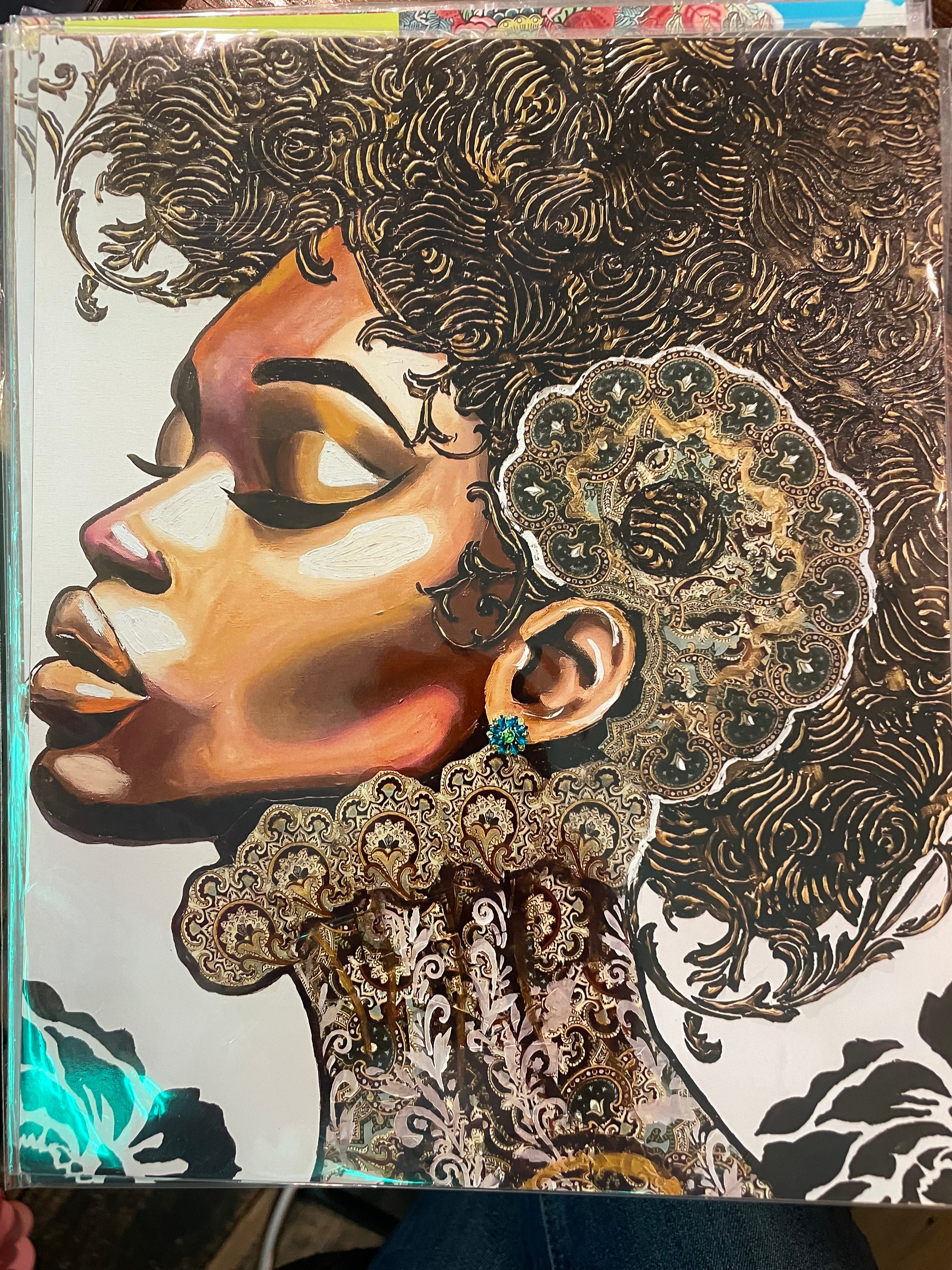 Sheila Fox, also known under the name GodivaGoddess, is a self-taught mixed media artist based in Louisville, KY. Fox has been drawing for over 20 years, and painting for almost 6. Her vibrant portraits of Black women take inspiration from Fox’s own lived experience as an African American woman, as she seeks to celebrate her story and the stories of generations of Black women through the joy of artistic expression.