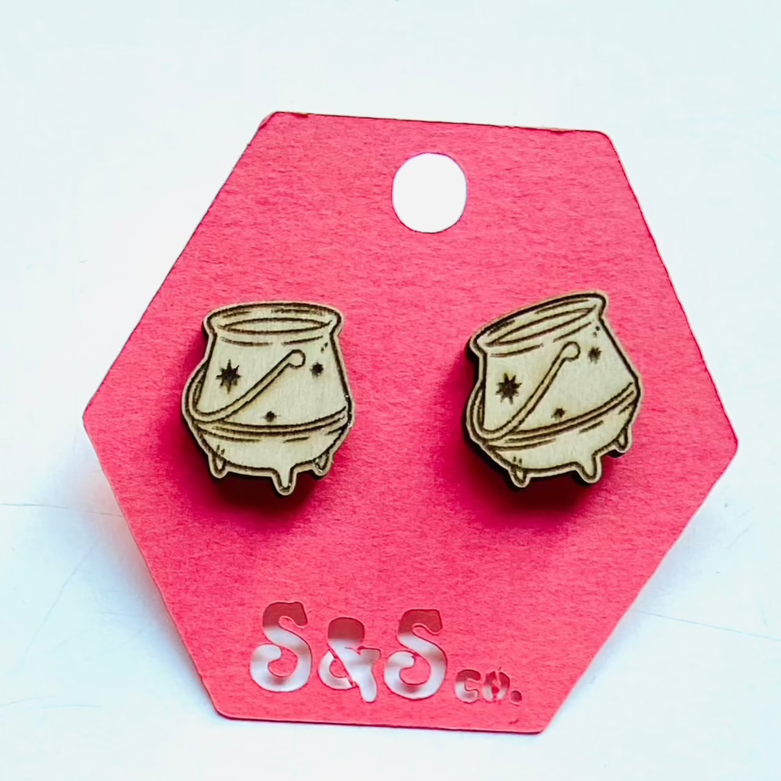 Laser-etched wood post earrings, by local artist Slate & Stone