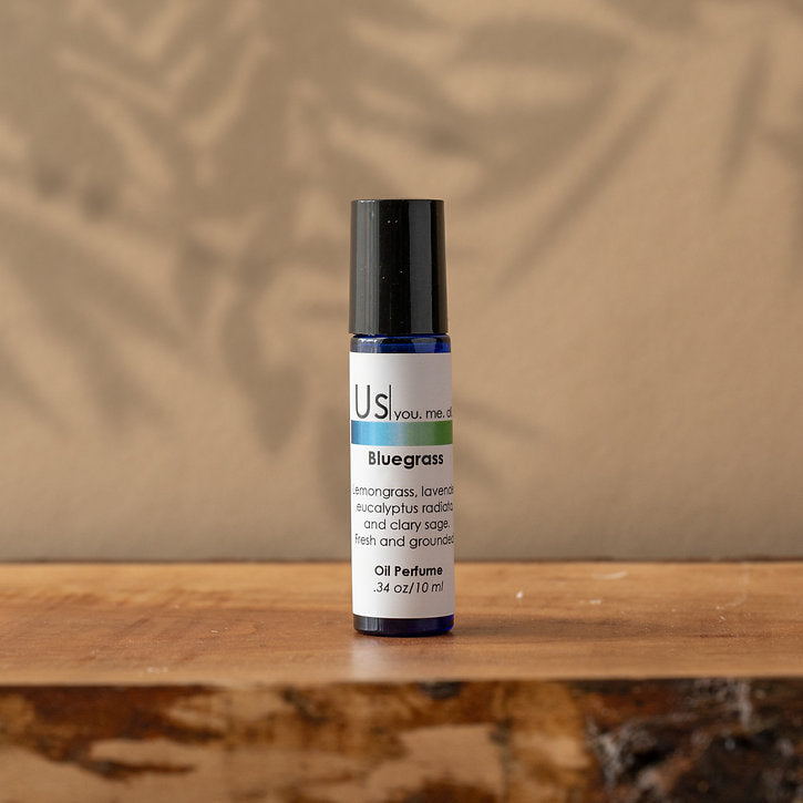 Bluegrass: Lemongrass, Lavender, Eucalyptus Radiata, and Clary Sage. A bright, uplifiting, grounded roll-on fragrance.